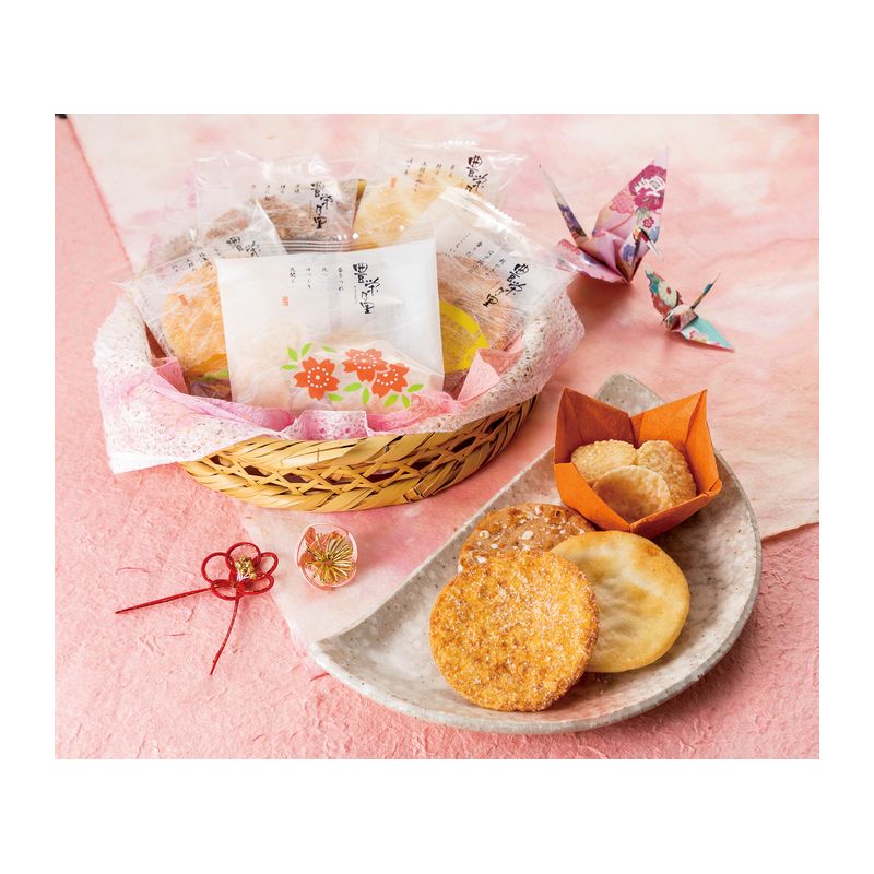 黒糖を練り込んだ生地に、沖縄県産黒糖使用の黒糖クリームと北海道産生クリーム使用のミルククリームの2種のクリームをのせた「黒糖ミルクせんべい」、香ばしい醤油味に、大粒のざらめをたっぷりちりばめた「ざらめせんべい」、海老の香りと塩の旨味が効いた「えびしおせんべい」、本醸造再仕込み醤油を使用した「しょうゆせんべい」、お米を粗挽きにし、お米の風味を感じられる「うす焼サラダせんべい」を詰め合わせたバラエティに富んだ米菓詰め合わせです。