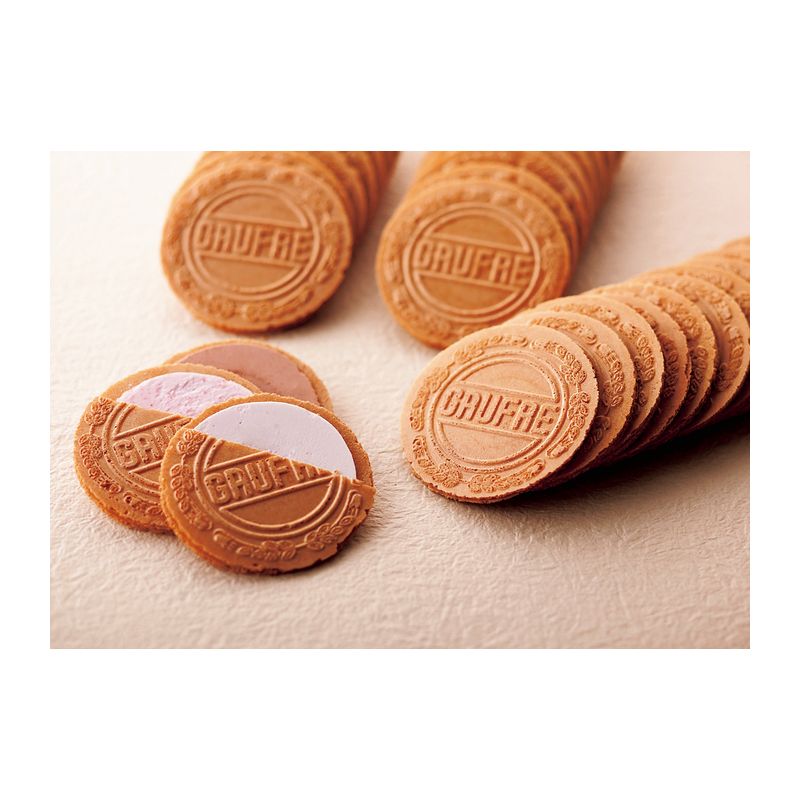 伝統菓子ゴーフルのパリッとした食感をそのままに、食べやすく、かわいらしいサイズに仕上げました。バニラ、ストロベリー、チョコレート、3種類のクリームを詰め合わせました。