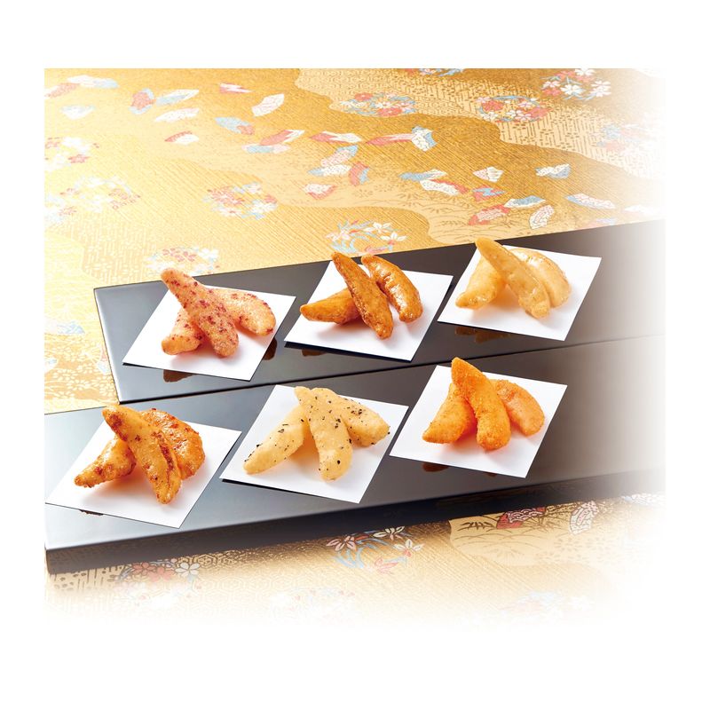 国産餅米100%の「柿の種」です。少し大きめの三日月型で、6種類の味付けをした、食べきりサイズの詰め合わせギフトです。