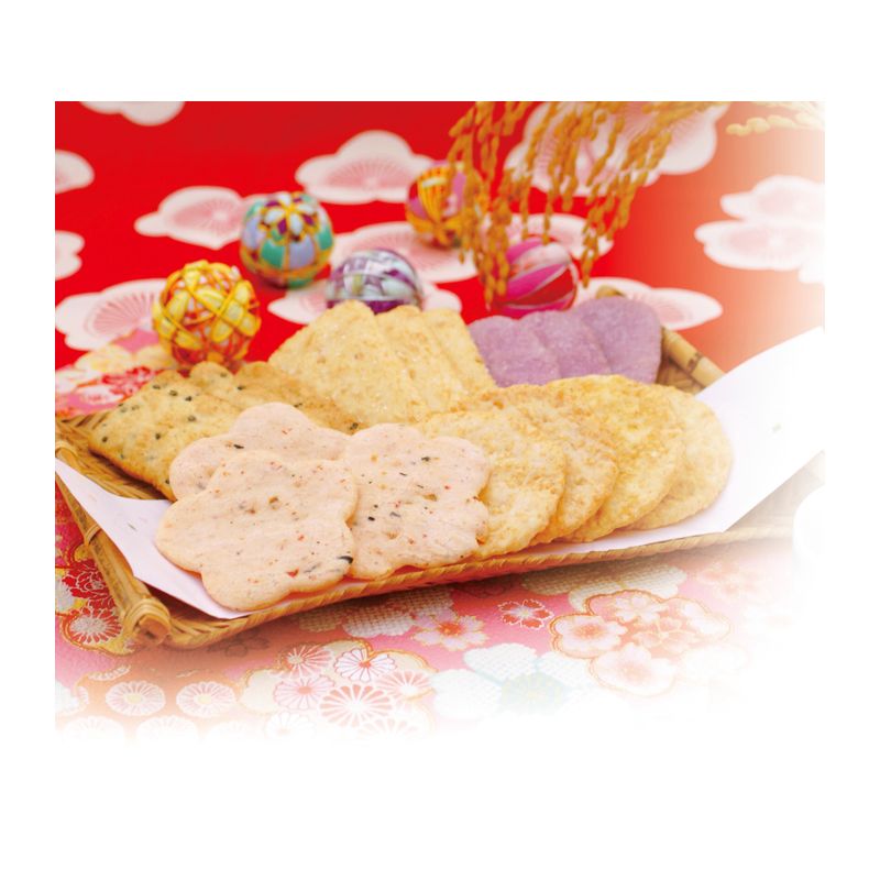 黒糖ごまざらめ煎餅×6枚、えびまめ花煎餅×4枚、つぶ焼きサラダ煎餅×4枚、黒ごま入り玄米煎餅×6枚、紫いも煎餅×6枚、金澤カレー煎餅×4枚