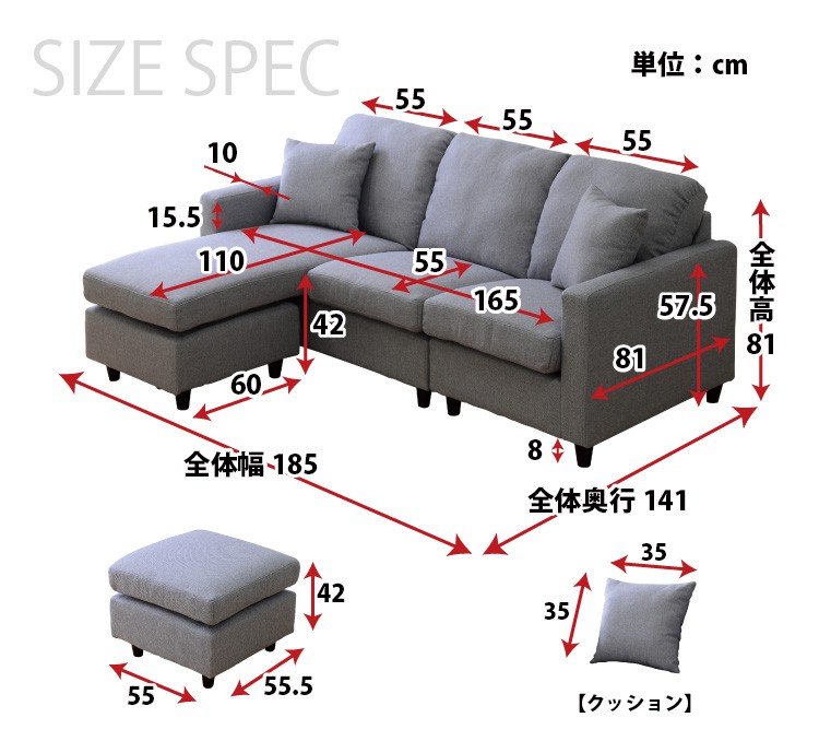 (約)幅185x奥行き81〜141x高さ81cm (脚部分)約8cm