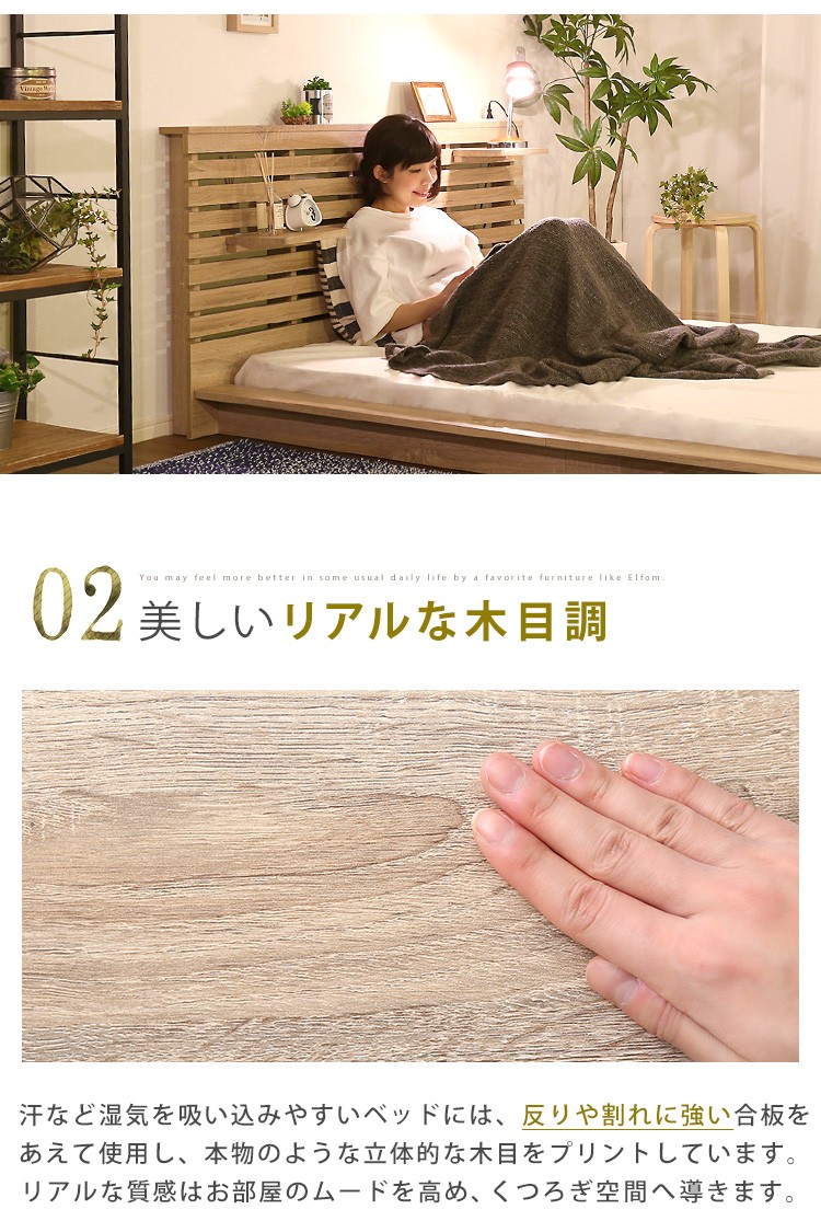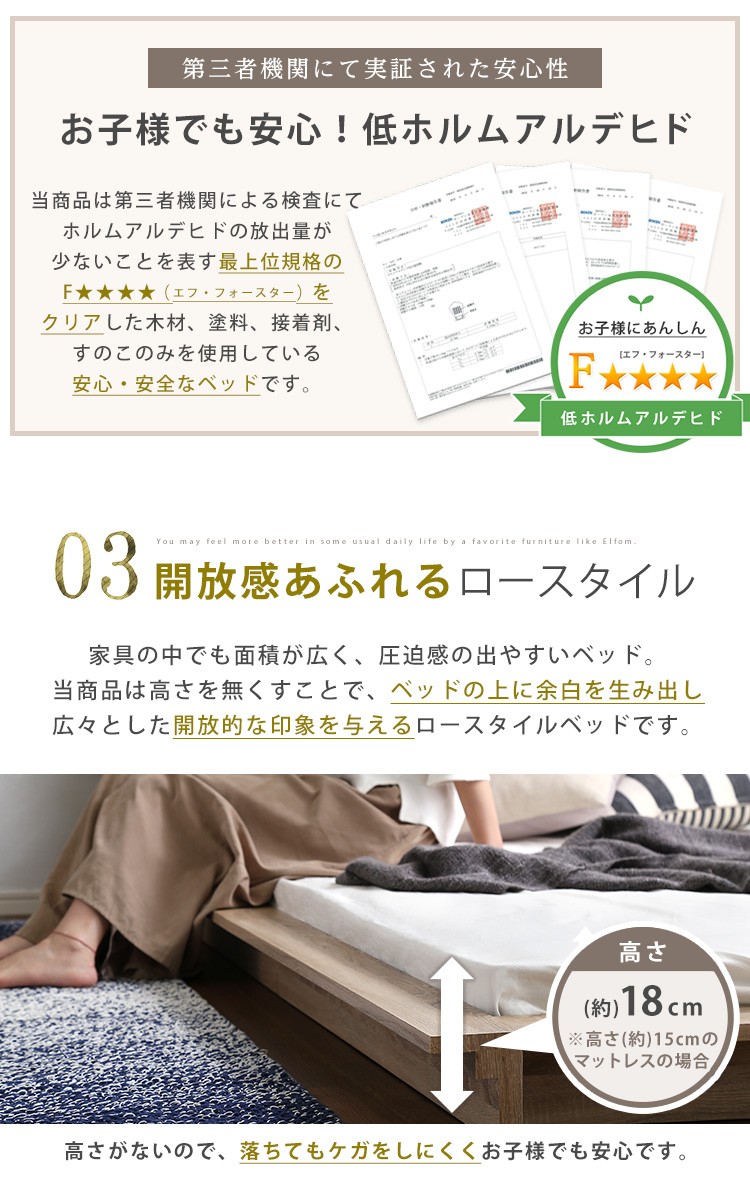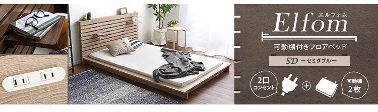 可動棚付きフロアベッド(ダブル)ベッドフレーム、ロースタイル、スリムヘッドボード|Elfom エルフォム
