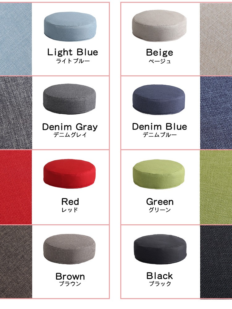 ライトブルー(LBL)、ベージュ(BE)、デニムグレー(GY)、デニムブルー(BL)、レッド(RD)、グリーン(GE)、ブラウン(BR)、ブラック(BK)