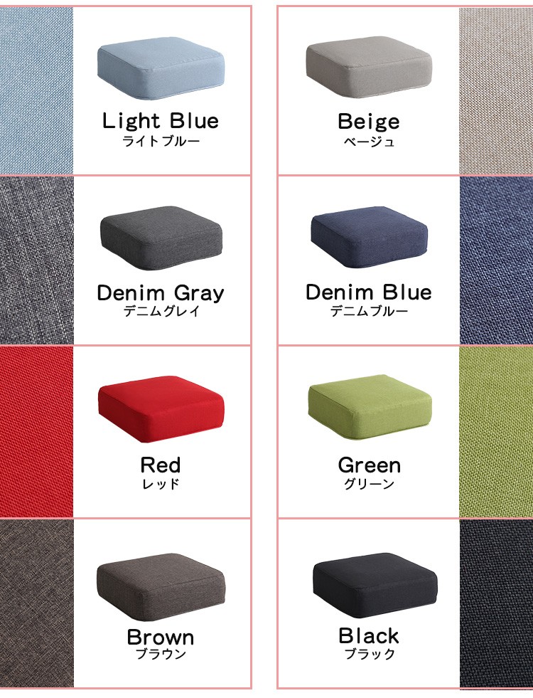 ライトブルー(LBL)、ベージュ(BE)、デニムグレー(GY)、デニムブルー(BL)、レッド(RD)、グリーン(GE)、ブラウン(BR)、ブラック(BK)