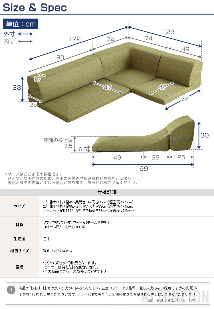 コーナー:(約)幅74x奥行き74x高さ33cm(座面高:7.5cm)
