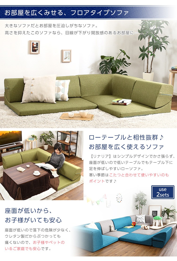 コーナーフロアソファ ロータイプ ファプリック 3人掛け(5色)組み替え自由|Linaria-リナリア-