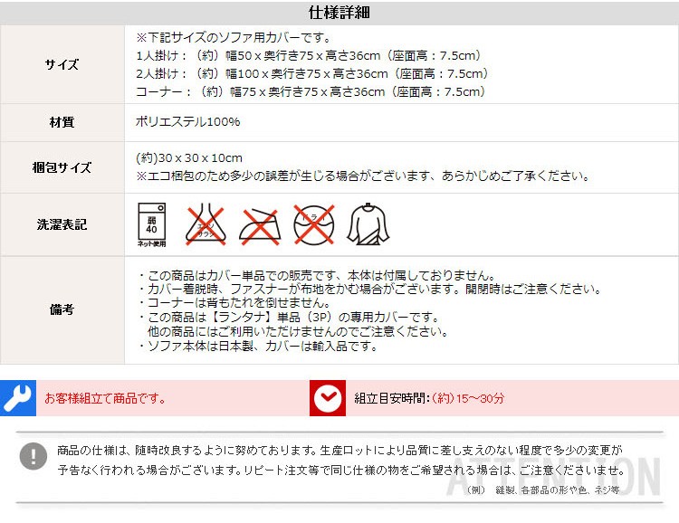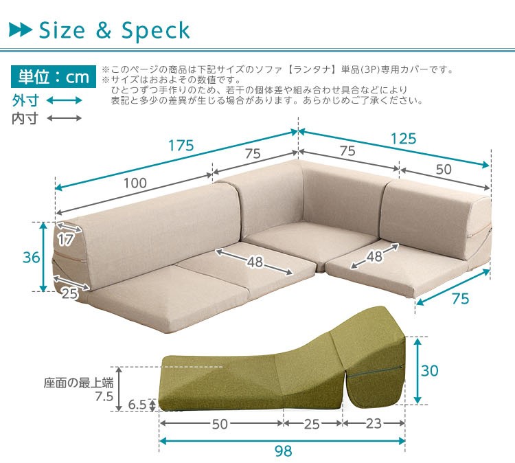 コーナー:(約)幅75x奥行き75x高さ36cm(座面高:7.5cm)