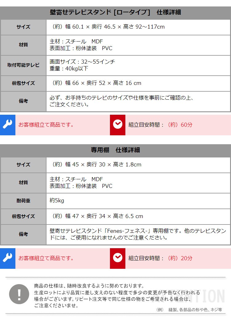壁寄せテレビスタンド ロースイングタイプ ロー・ハイ共通 専用棚 SET