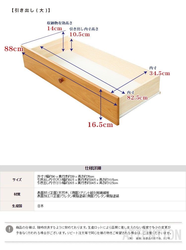 引き出し内寸(大):(約)82.5x34.5x10.5cm