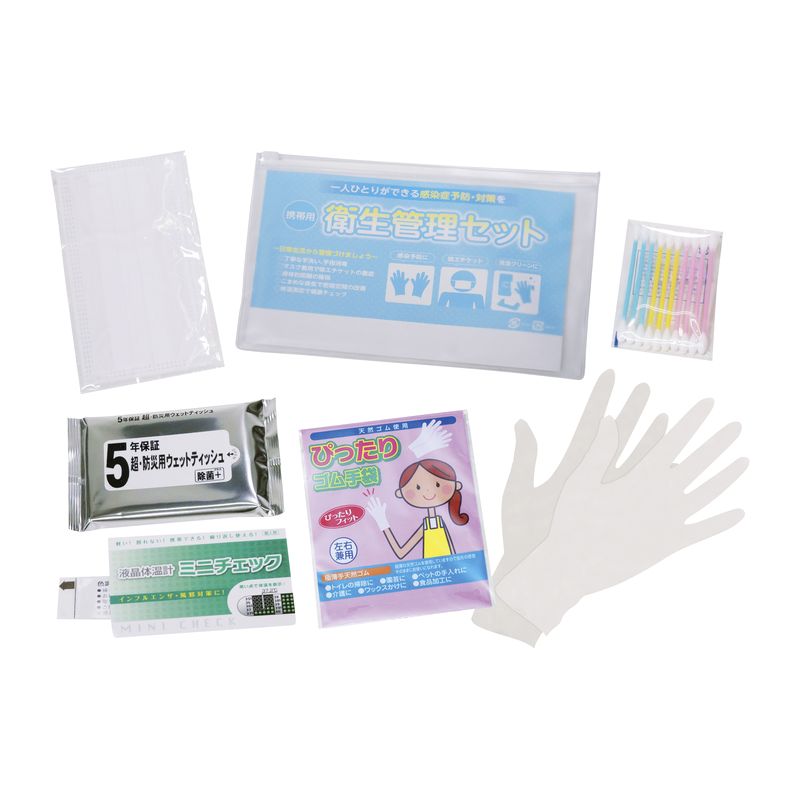感染予防に必要な衛生用品をセットしました。ケース入りなので携帯でき衛生的です。