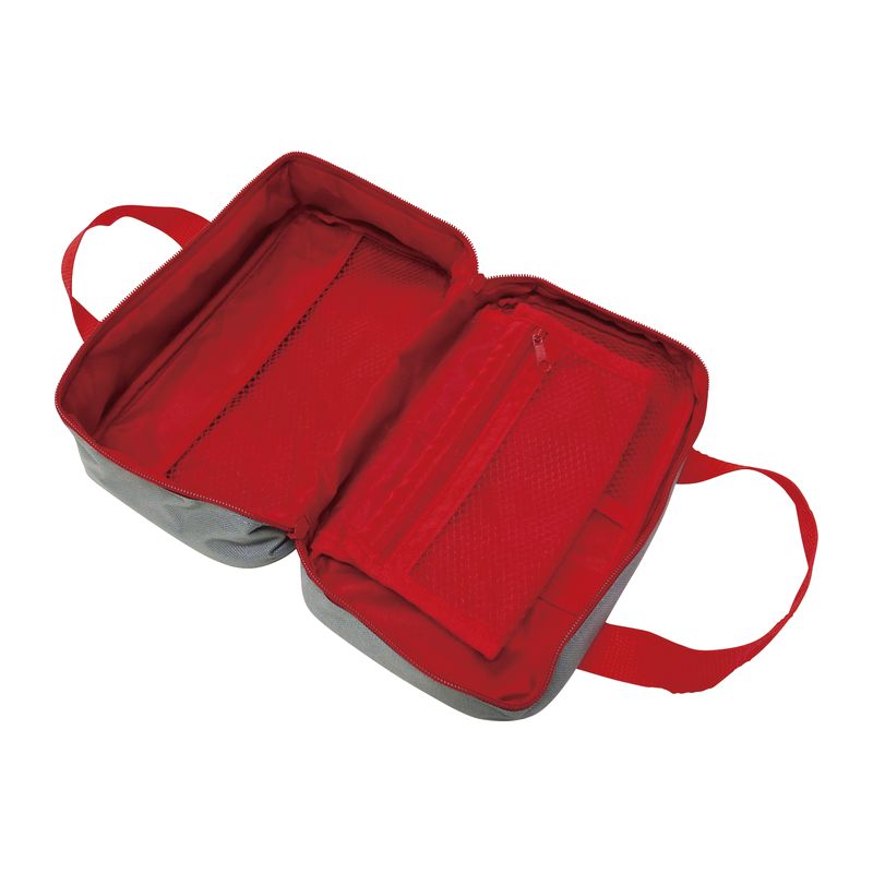 救急アイテムをいざというときに持ち出せる収納ポーチ。メッシュポケットと固定バンド付で整理しやすい。中身が取り出しやすいよう180度に大きく開きます。
