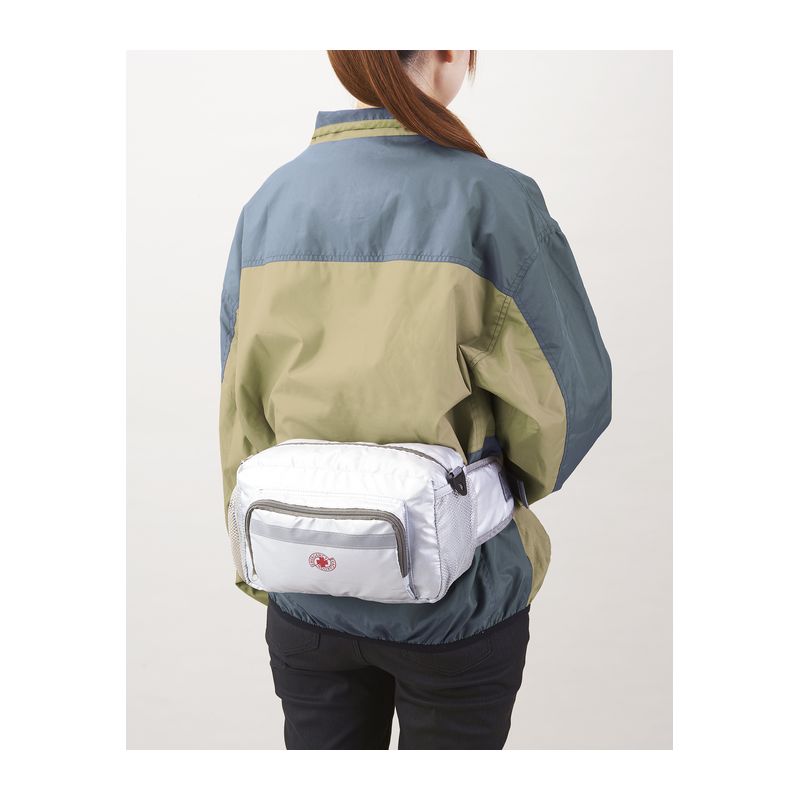 避難用ウエスト&ショルダーバッグ:160×260×120mm、9光ライト(電池別売)、ウェットティッシュ(10枚)、緊急携帯トイレ(大小兼用)1P、マスク、軍手、使い捨てカイロ、ホイッスル、エイトバン(大小×各2)、ポケットティッシュ