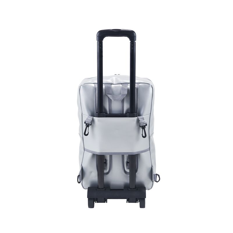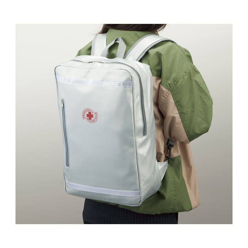 避難用リュックバッグ:450×300×130mm、ダイナモエマージェンシーライト(電池別売)、軍手、ウェットティッシュ(20枚)、ホイッスル、防寒アルミシート、エイトバン(大小×各2)、首枕、アイマスク、耳栓、マスク、防寒レインコート、ポリラップ、キャリーカート×各1、ポケットティッシュ、緊急携帯トイレ(大小兼用)1P、使い捨てカイロ×各2