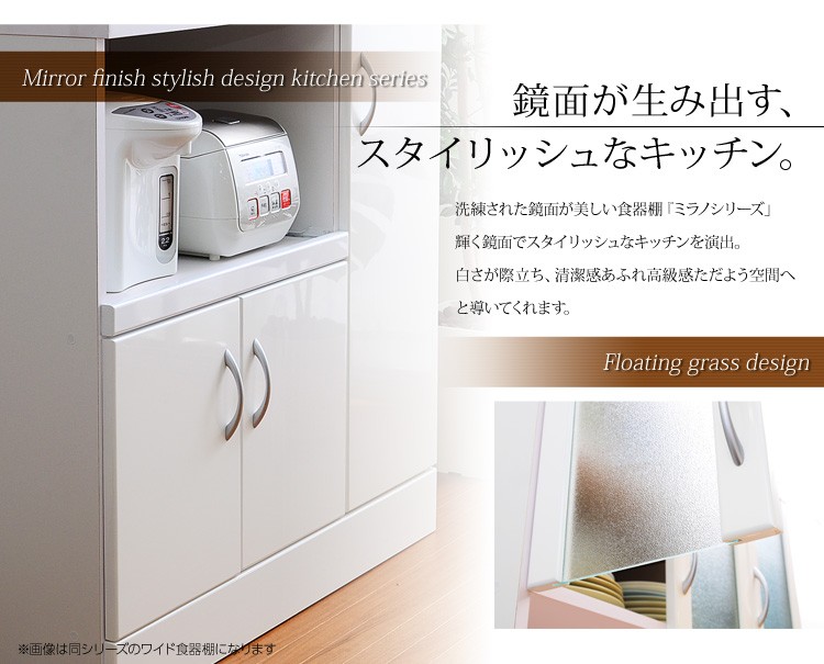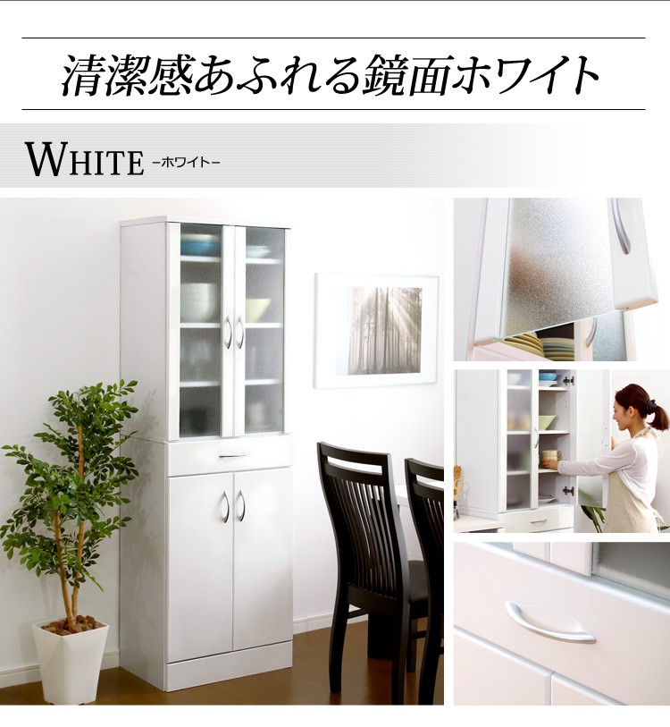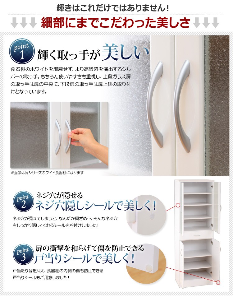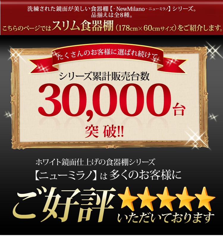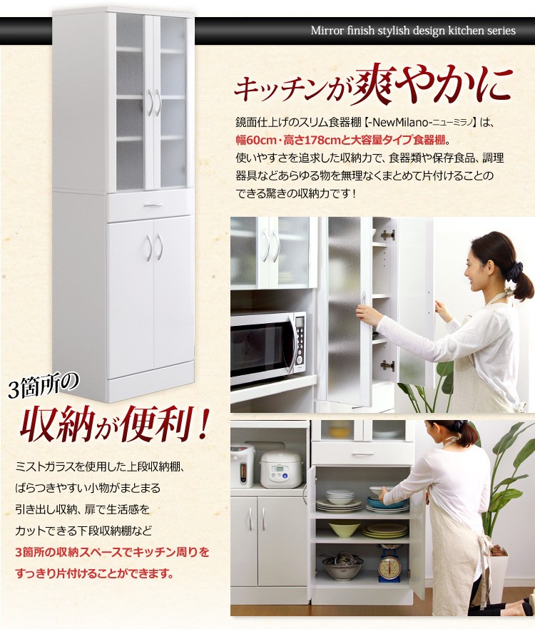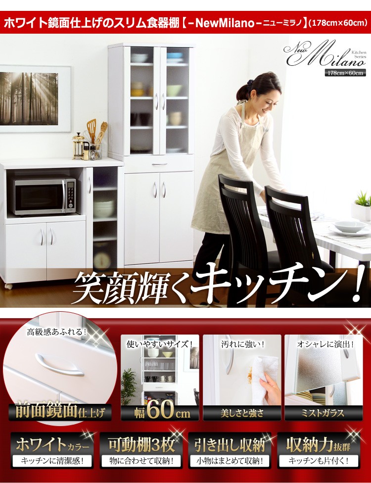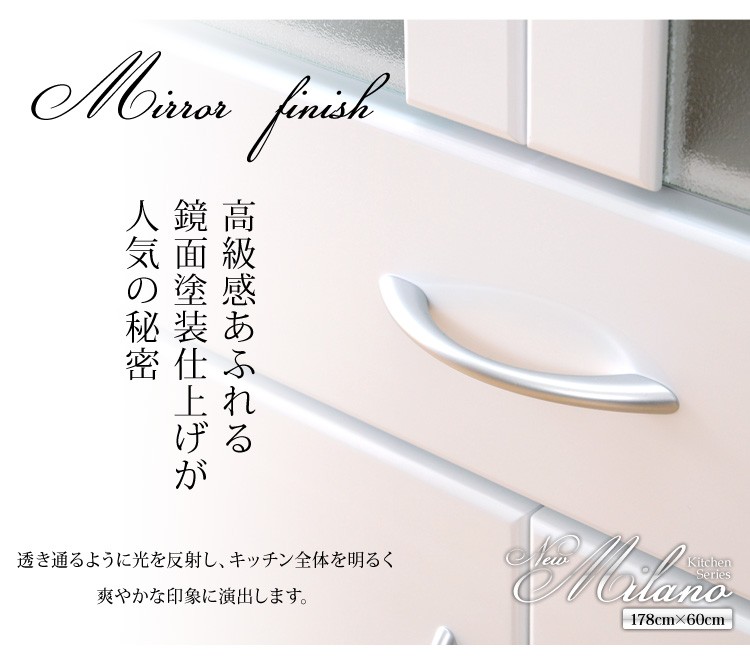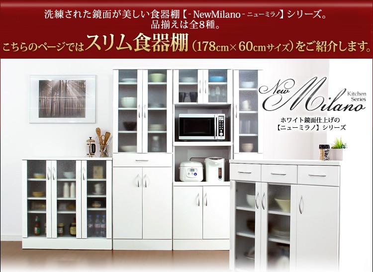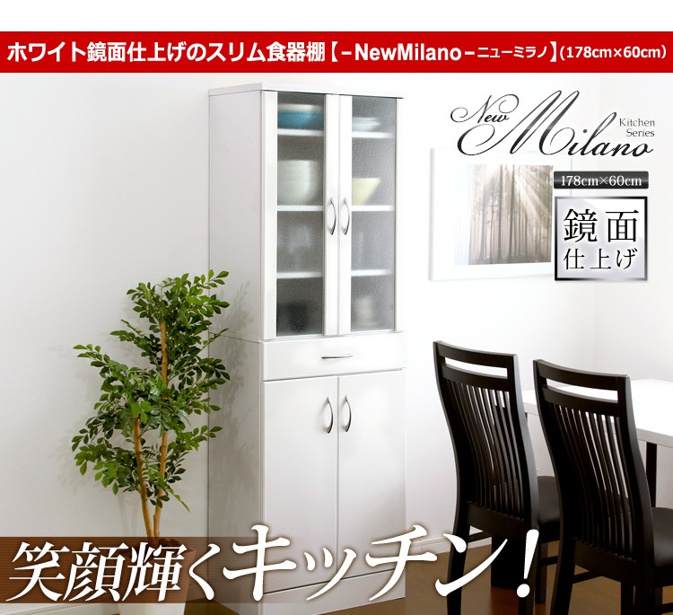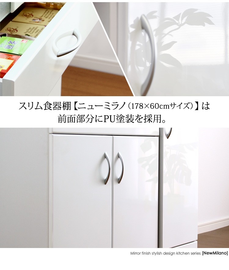 ホワイト鏡面仕上げのスリム食器棚【-NewMilano-ニューミラノ】(180cm×60cmサイズ)