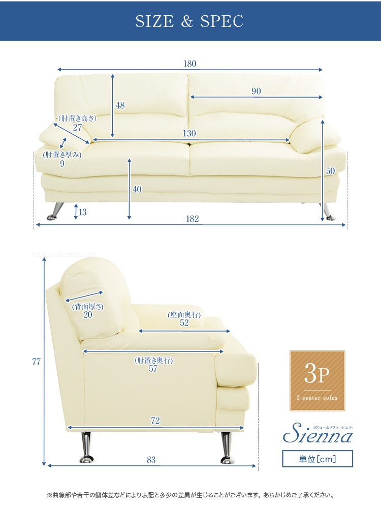 ボリュームソファ3P【Sienna-シエナ-】(ボリューム感 高級感 デザイン 3人掛け)