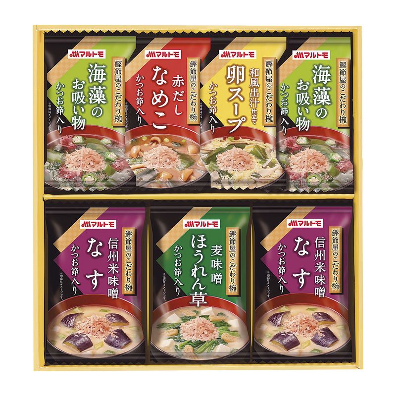 フリーズドライの即席みそ汁と卵スープの詰合せギフト。 ・かつお刻み節を加え、旨味、コク味ともにアップ!4種全てにかつお刻み節入り ・具材に合った味噌を使用! ・食べたい時にお湯をそそぐだけ!おいしいおみそ汁がすぐに食べられます!