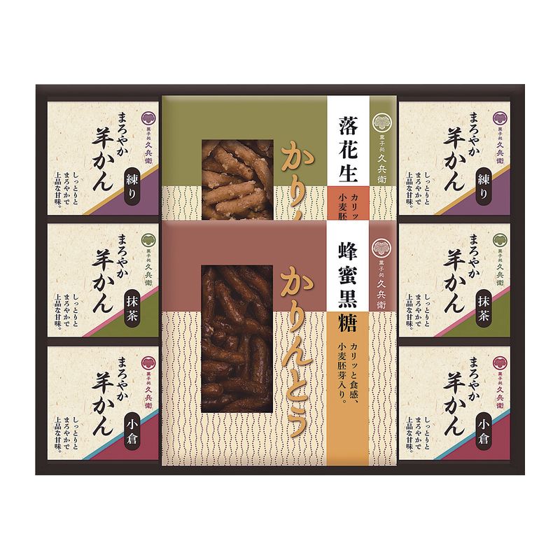 蜂蜜・黒糖の程良い甘さの蜂蜜黒糖かりんとう、香ばしい落花生をまぶした落花生かりんとうに、喉ごしにこだわった抹茶・練り・小倉の3種の味の羊かん、あられ各種など日本のおやつの詰合せです。