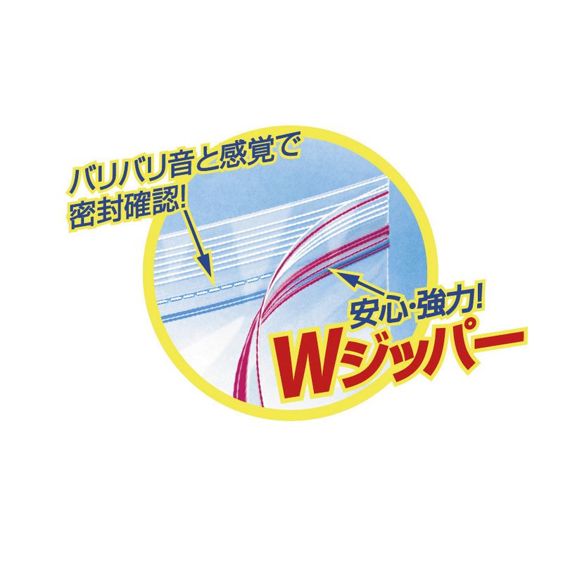 Wチャックで密封性バツグン!バリバリ音と感覚で密封確認が簡単に出来る!レッドとブルーのカラージッパー採用で視認性抜群!内容物や保存日が書けるメモスペース付き。