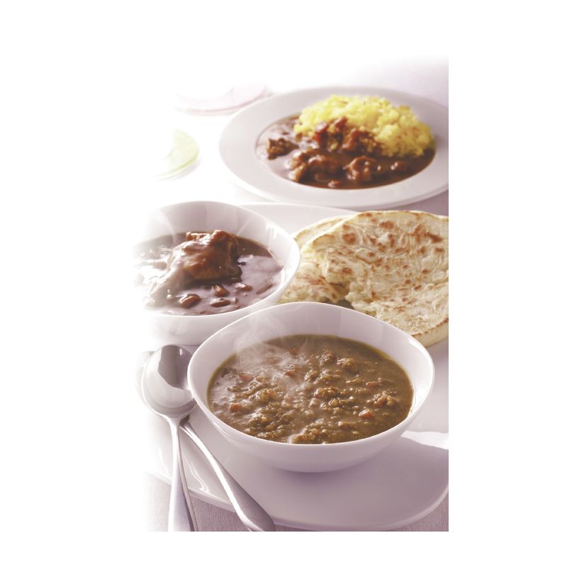 九州産・銘柄鶏「華味鳥」を使用し、水たき料亭「博多華味鳥」総料理長が監修したチキンカレーのセットです。華味鳥のもも肉をたっぷりと加え、もも肉のジューシーさを最大限に活かした「華味鳥カレー」、華味鳥の手羽元を丸ごと1本使用し、じっくり煮込んだ「手羽元カレー」、華味鳥の挽き肉をたっぷり使用したボリュームのある「キーマカレー」の3種類をセットに致しました。自慢の「水たきスープ(鶏がらスープ)」を隠し味に加えることによって、コクのある味わいに仕上げております。