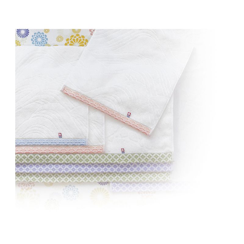 日本の伝統・小紋柄とラメのラインでさりげなく彩られたシンプルなタオル。一見、白無地に見える面にも模様が施されています。