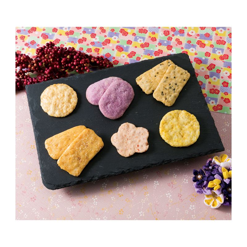 黒糖ごまざらめ煎餅×6、えびまめ花煎餅×4、つぶ焼きサラダ煎餅×4、黒ごま入り玄米煎餅×3、紫いも煎餅×3