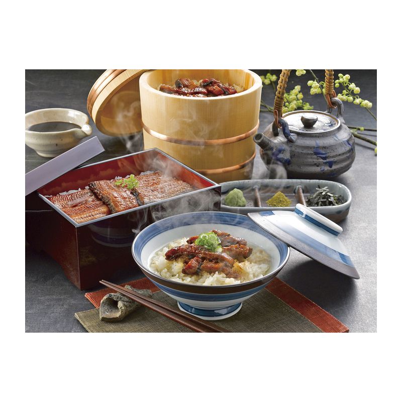 蒲焼カット(うなぎ:愛知県産)60g×3、山椒0.2g×3、鰻きざみ(うなぎ:国産)50g×3、吸い地(ダシ)120g×3、蒲焼たれ50mL×2、おろしわさび2.5g×3、きざみのり0.5g×3