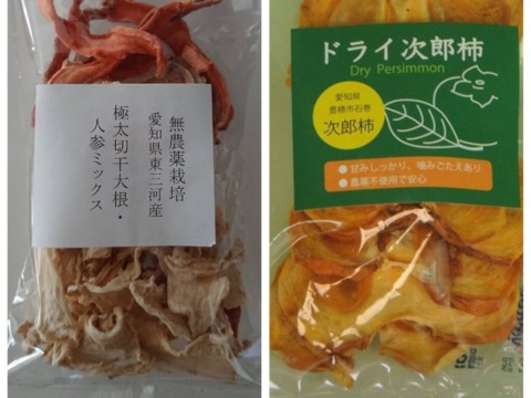 ドライ次郎柿1個&極太切干し大根×3、極太切干大根人参ミックス3、極太切り干し人参3