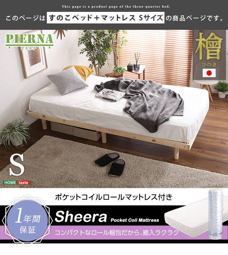 3段階高さ調節 国産総檜脚付きすのこベッド 【Pierna-ピエルナ-】(ポケットコイルロールマットレス付き) シングル