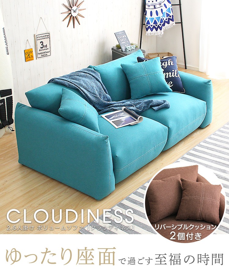2.5人掛けデザインソファ(クッション2個付き) シンプルモダンローソファ 布地|Cloudiness-クラウディネス-