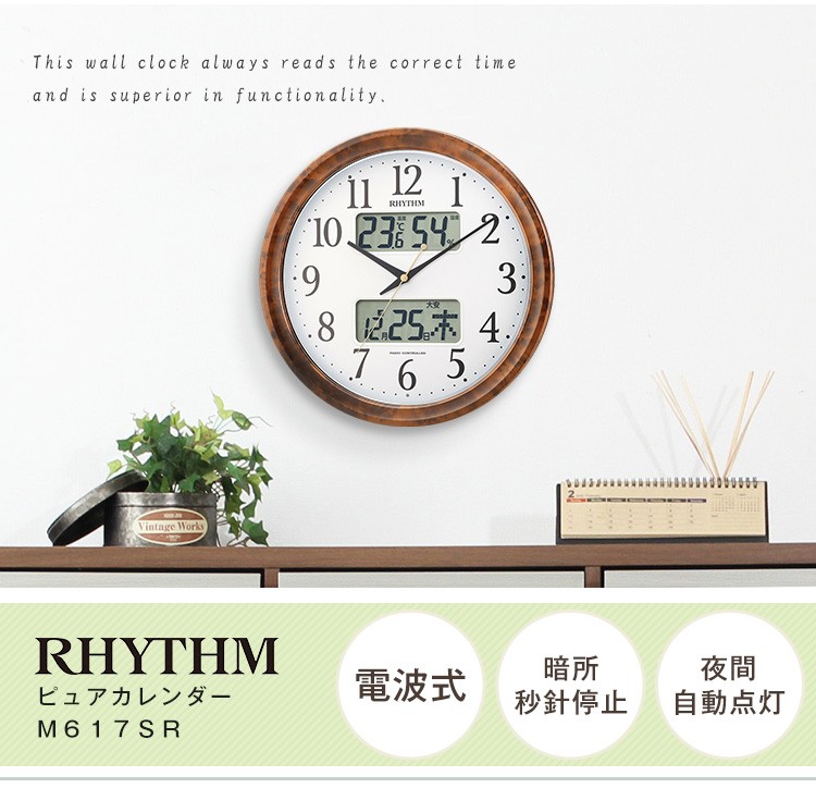 シチズン温度・湿度計付き掛け時計(電波時計)カレンダー表示 暗所秒針停止 夜間自動点灯 メーカー保証1年|ピュアカレンダーM617SR