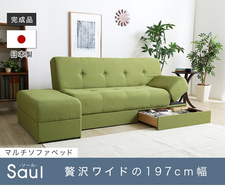 マルチソファベッド(ワイド幅197cm)スツール付き、日本製・完成品でお届け|Saul-ソール-