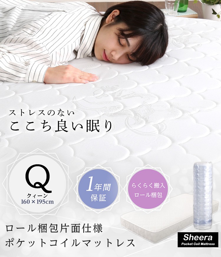 ロール梱包片面仕様ポケットコイルマットレス【Sheera-シェエラ-】クイーンサイズ ホワイト